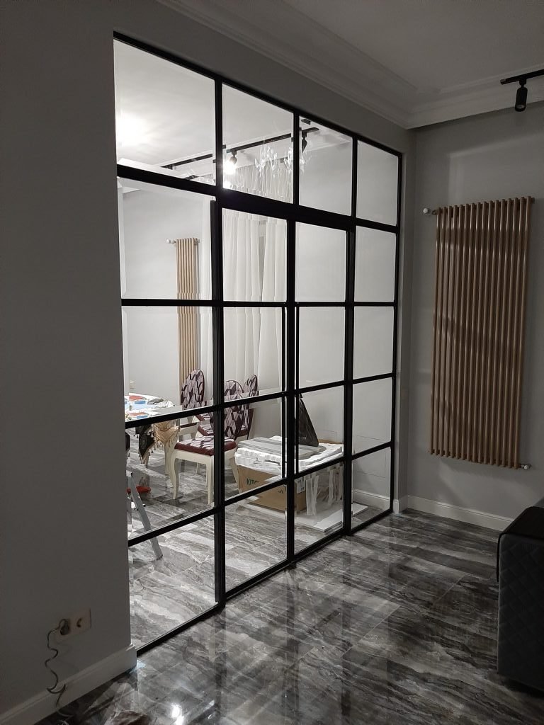 Цена на перегородки лофт для зонирования пространства во многом зависит от размеров, выбранного стекла (матовое, закаленное, с рисунком и др.), выбранного профиля, вида открывания двери и прочих параметров.